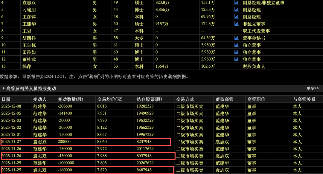 2025年11月25日、11月26日,袁志双分别以7.87元/股、7.98元/股的交易均价减持了16万股、45万股,但在次日(11月27日),又以8.06元/股的交易均价买回20万股。